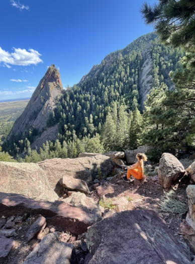 After the thousands of calories I consumed yesterday, I figure I’ll embrace the great outdoors of Colorado and go for a hike. When I arrive at Chautauqua Park, I’m taken aback by how beautiful the mountains are. It was like someone put a magnifying glass on my eyes because they were so close. I decide to challenge myself and hike up to the first Flatiron. There are several different trails leading to the different Flatirons, each varying in difficulty. I take the Chautauqua Trailhead, where I greet lovely locals and cute dogs who are sadly in better shape for the hike than I am. I start the hike at 7:30 a.m. when the weather is still cool. However, I’m grateful I’m wearing shorts and a tank top because the Colorado sun is no joke! Water and a granola bar are necessities to keep my energy levels up throughout the hike. After an hour and a half, I finally reach the top of the first Flatiron, and the breathtaking view blows me away. I can see all of Boulder, including the very recognizable CU Boulder campus. I can even see Denver way off into the distance. After taking a breather and snapping a hundred pictures, I make my way back down to the bottom.